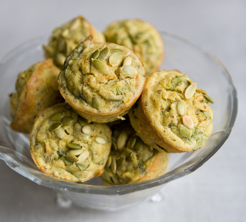 Set the oven at 350°F. Mix all the dry ingredients in a bowl and set aside. Whip egg and yoghurt in another bowl. Add spinach, carrots, onion, lemon and garlic, stir for a minute and then add all the dry ingredients. Pour in muffin tins, top with pumpkin seeds and bake for 25 minutes.
