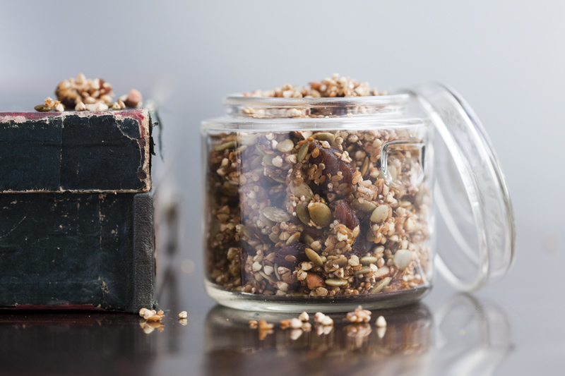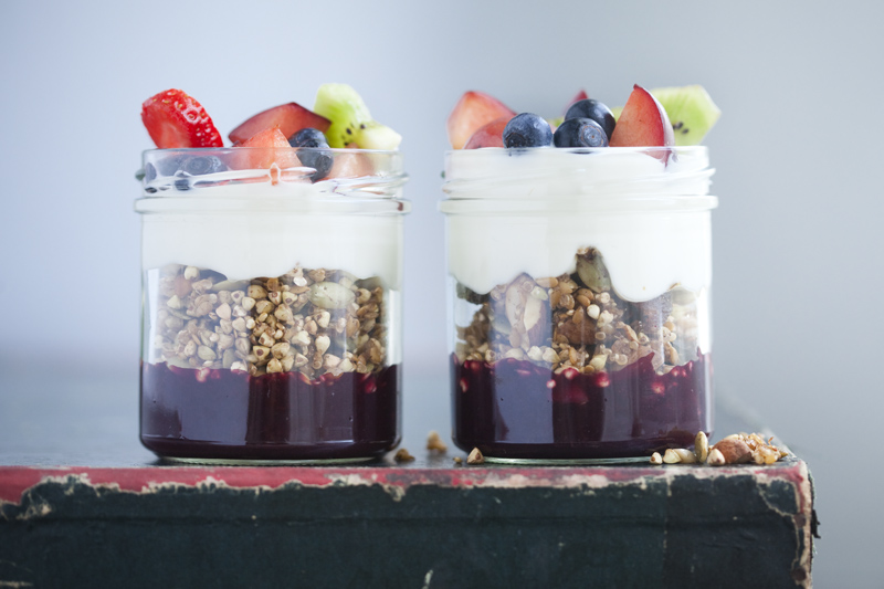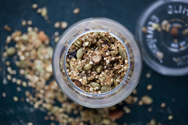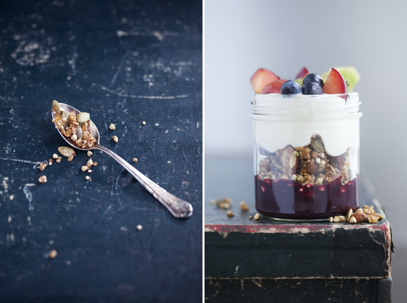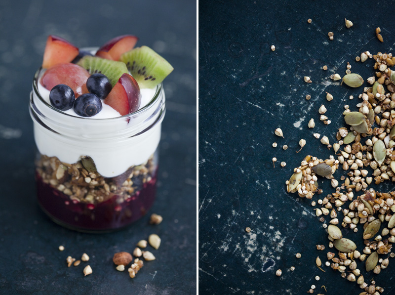 We wanted to create something that we had never tried before, and came up with this unusually pretty breakfast dish. We sprouted buckwheat and quinoa and then dried them in a dehydrator (or at the lowest temperature in the oven) – together with linseeds, pumpkin seeds and dried fruit. What comes out is a raw sprouted granola that is crunchy, a little bit sweet, sticky and completely gluten free. Because of the sprouting, this recipe takes a few days to complete. But fear not, it is totally worth it. Serve it like we have done here – with a blueberry sauce, yogurt and some fresh fruit – and it will impress anyone. If you scroll down we give you a quick tutorial how to sprout. You can read the rest of the recipe at My New Roots.