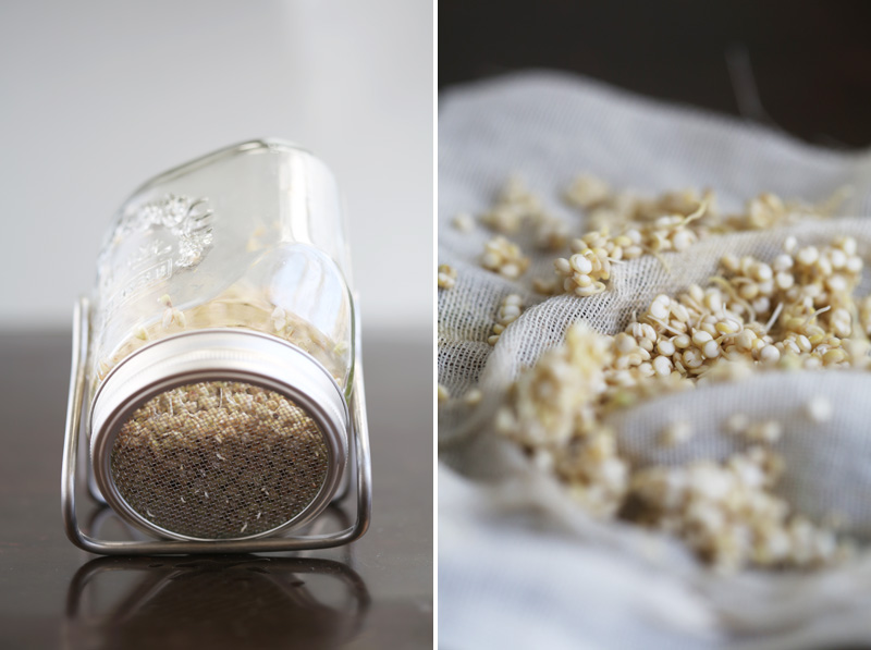 3. Set your sprouting jar in a bright place (out of direct sunlight) at room temperature. Rinse and drain well about every 4 hours (no, you don’t have to go up at night). The sprouts will be done in 36-48 hours or when the sprouting tail is as long as the seed. (Quinoa sprouts quicker than buckwheat).