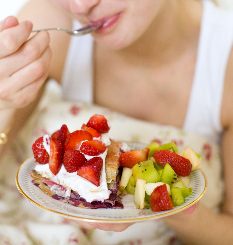 Start with one pancake. Spread half of the banana mash on it and put a new pancake on top of it. Spread out half of the blueberries and put a new pancake on top of it. Half of the strawberries, new pancake, half of the raspberries, new pancake, all of the almond/date mixture, new pancake. Repeat until all the pancakes have filling in between the layers. The top pancake shouldn’t have any filling.