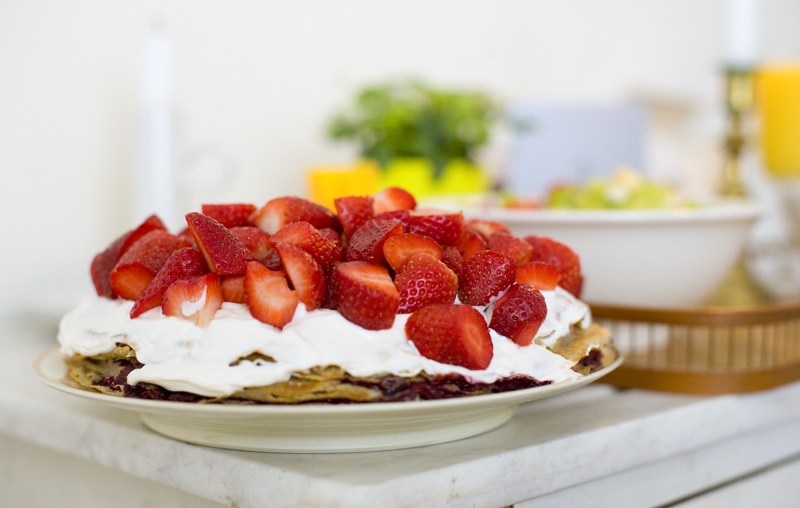 Luise turned 25 this weekend (happy birthday!!!) and she had requested a homemade birthday cake. During our time together we have already tried a couple of different cakes, so instead of repeating myself I decided to try something new. I wanted it to look and taste like summer and after some consideration I thought it would be fun to make my own version of the classic Swedish Pancake Cake. It’s famous in Sweden because of the children’s book Pettson & Findus by Swedish writer Sven Nordqvist. You normally bake it for kids parties, but grown ups love it just as much.