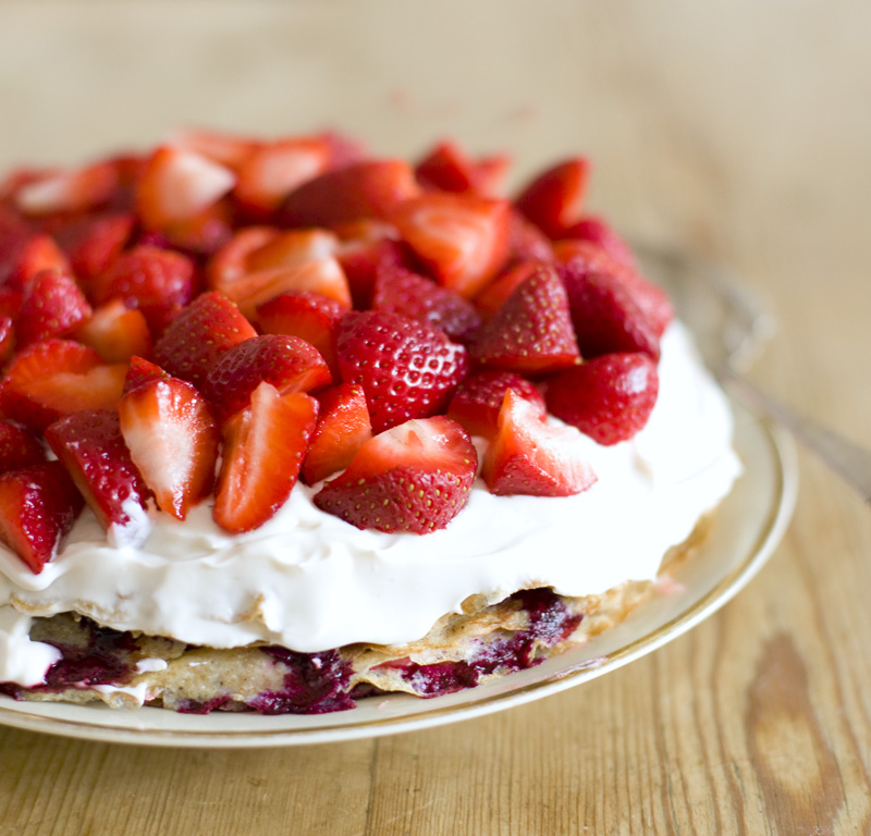 The recipe is silly easy and you can vary it after your own taste. What you basically do is make a pile of thin pancakes, put different fillings or jams between the layers and top it with whipped cream and fresh fruit. I made our’s little healthier by using spelt flour and oat milk in the pancake recipe, fresh fruit instead of jam between the layers and a soya cream instead of regular whipped cream. I also made a special almond and date filling between one of the layers, since we are both crazy about almonds.