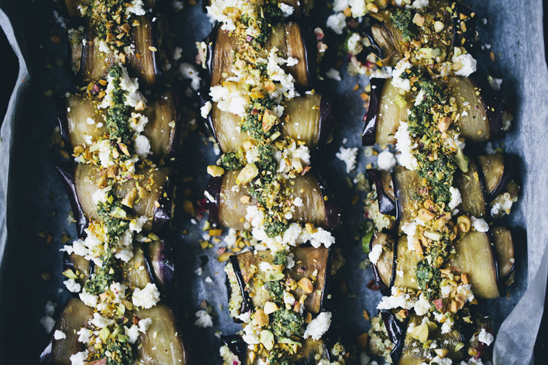 This one has a brighter and tangier filling than the original and is baked without the tomato sauce. The filling is made with a mix of asparagus, rhubarb, pesto, pistachios, feta cheese, raisins and cooked quinoa. It is a really delicious filling that could also be served on its own (but it looks so much more impressive tucked inside the aubergine rolls). We served the rolls with a green salad drizzled with a little yogurt dressing. It was totally delicious and would be quite an impressive dish to do if you have friends coming over for dinner. I know we always say this, but do save some time (and effort) and let everybody get involved and help roll. Cooking and eating is so much more fun when the experience is shared.