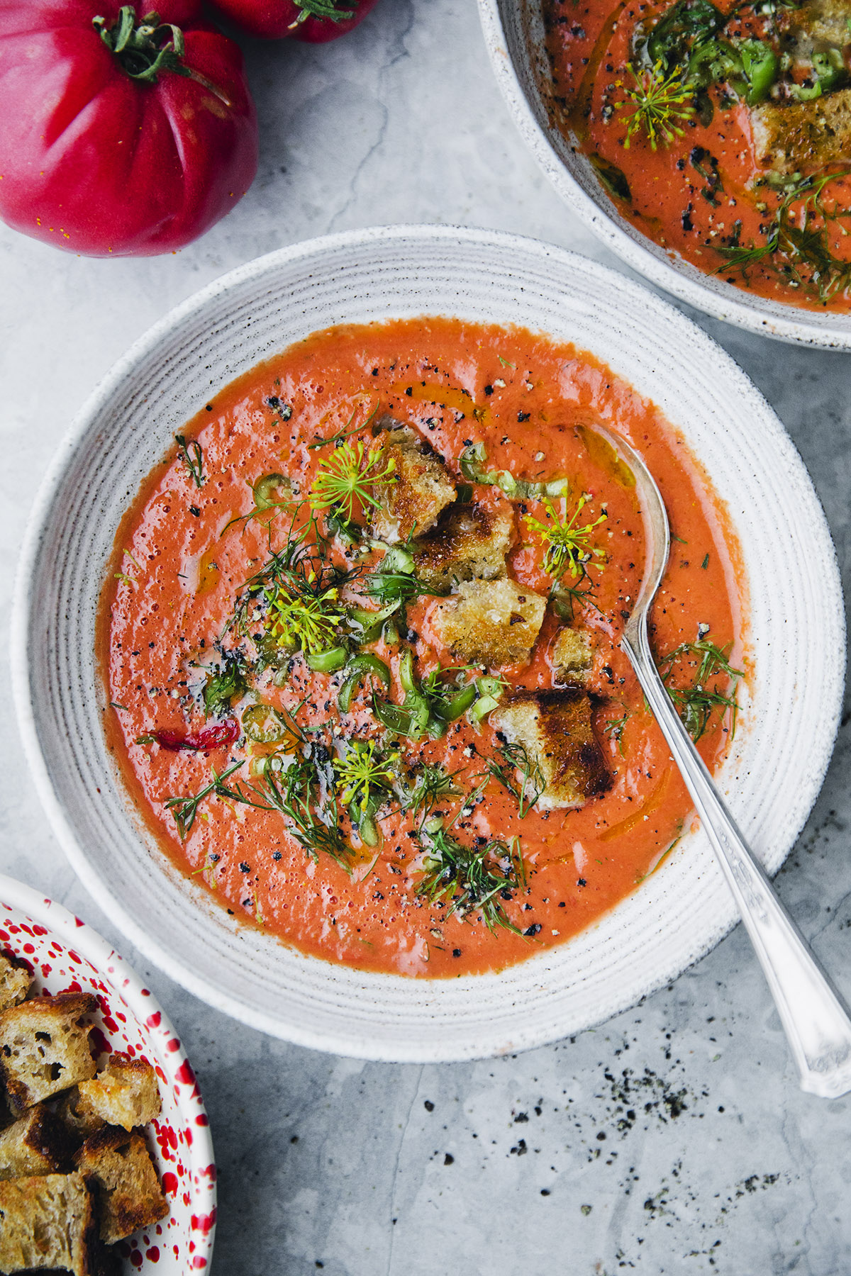 Traditional gazpacho recipes include bread in the soup but we think it's fresher to leave it out and fry the bread into croutons for topping instead. The combo of warm crunchy bread on cold soup is phenomenal. One other thing we have done a little differently is adding dill to the soup. We have been obsessed with dill lately and it pairs really well with tomatoes. Kind of like basil's more interesting sibling.