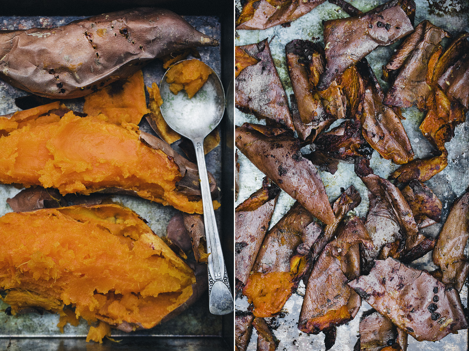 Like so many, I have been a fan of Yotam Ottolenghi and his Test Kitchen crew for years. They create just the kind of vegetable centered and flavored forward food that I want to eat (even if it requires a slightly expanded pantry and spice section). This Sweet Potato Shakshuka is from their new book Shelf Love. Traditional shakshuka is made on a spiced tomato base with eggs cooking in the sauce and this is definitely a different take. We cooked it for dinner tonight and it was a real treat. Our kids aren't usually too keen on Shakshuka but they shoveled this down. I love recipes that use the whole vegetable and here the baked sweet potato flesh is the base of the shakshuka and the peel becomes a crunchy topping that you can use to scoop it up with. Or just eat them as chips, as Noah (our youngest) did.