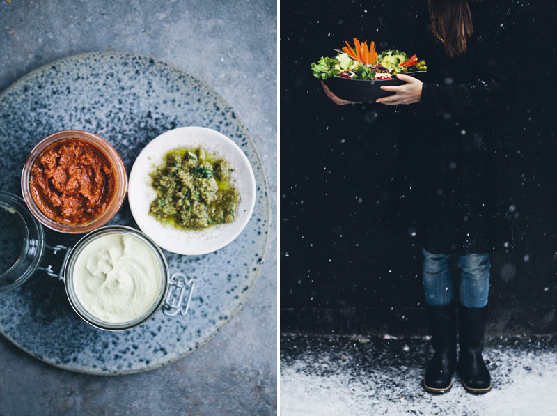Last Friday we came up with a new version of that dinner. We gathered a rainbow selection of warm and cold vegetables, brown rice and creamy spreads in one huge bowl and then let everyone grab a fork and eat straight from the bowl – family style! We placed blankets on the living room floor, put the bowl in between us and had a movie night/indoor picnic while the snow was coming down outside. It was perfect. Until Isac sat down in the bowl. But we weren’t that hungry anyway …