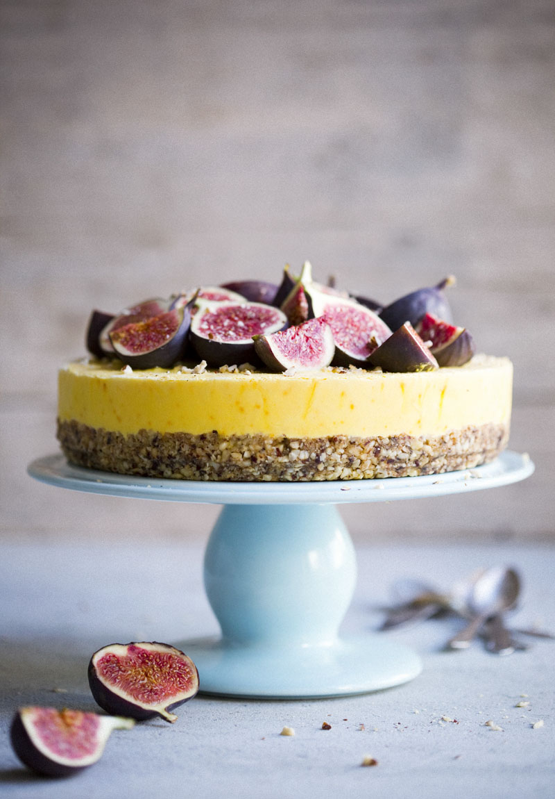 Making the filling: Place turkish yoghurt, coconut milk and honey in a medium size mixing bowl and whisk to combine. Stir in the powdered saffron very gently with a spoon. Remove the spring-form cake tin from the fridge and pour the saffron filling on top of the crust. Then place the spring-form in the freezer for minimum 2 hours (you can keep it in the freezer for days but then you have to let it thaw for about 15-20 minutes before serving it). Top the cake with fresh figs, drizzle with honey and finely chopped hazelnuts. Serve immediately.