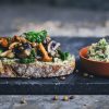 Place one lettuce leave and one kale leave on each tortilla bread, then place 2-3 tbsp quinoa in the middle, a dollop ajvar, cucumber slices, sauerkraut and top with a couple of aubergine polpette. Fold the top and bottom edges over the filling. Roll the whole tortilla from left to right to wrap in the filling. Roll some parchment paper around them and tie with a string to hold them together.