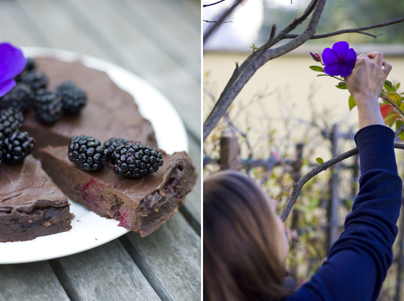 Before we left, we made this chocolate cake filled and topped with blackberries. Actually it’s not very difficult to make a normal chocolate cake, you can probably find 5 zillion good recipes on google and at least 70 on Martha Stewart. But our cake is made without eggs, butter, sugar and flour, which made everything a little bit more challenging. We tried three different versions of this cake before finding the right balance between fruit vs chocolate, sticky vs dry and sweet vs dark and rich.