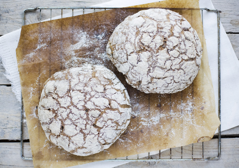 Place the dough on a lightly floured surface and divide it into two pieces. Kneed them into two round doughs that you leave to rise for about 3 hours. Use round rising baskets/bannetons if you have. Dust the baskets generously with flour before placing the dough inside them. If you don’t have a rising basket, place the breads on parchment paper and cover with a clean towel. Preheat the oven to 525F (275°C), place a baking sheet or a baking stone in the middle and a baking sheet on the lowest possible.
