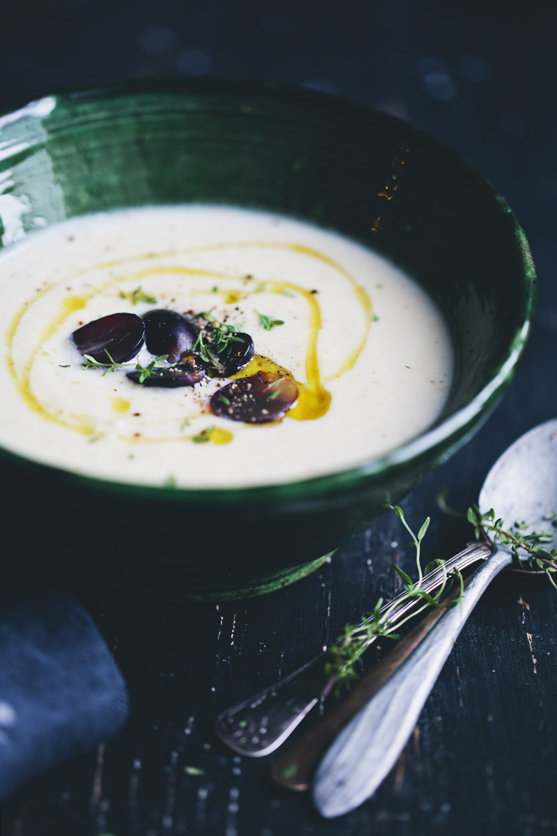 Hey friends, we are just checking in quickly from our chaotic life in an apartment filled with moving boxes to share a wonderful little soup recipe with you. It’s a savory, creamy and slightly sweet almond & garlic soup that we top with red grapes. It is kind of inspired by a Spanish White Almond Gazpacho, but our version is served warm and with roasted roots. We wanted it to feel like a thick warm almond milk with lots of flavor. It has quickly become one of our favorite recipes this spring, both as lunch and dinner. And the grapes on top truly adds a nice and fruity twist. If you are having guests over, it could also be really nice as a starter.
