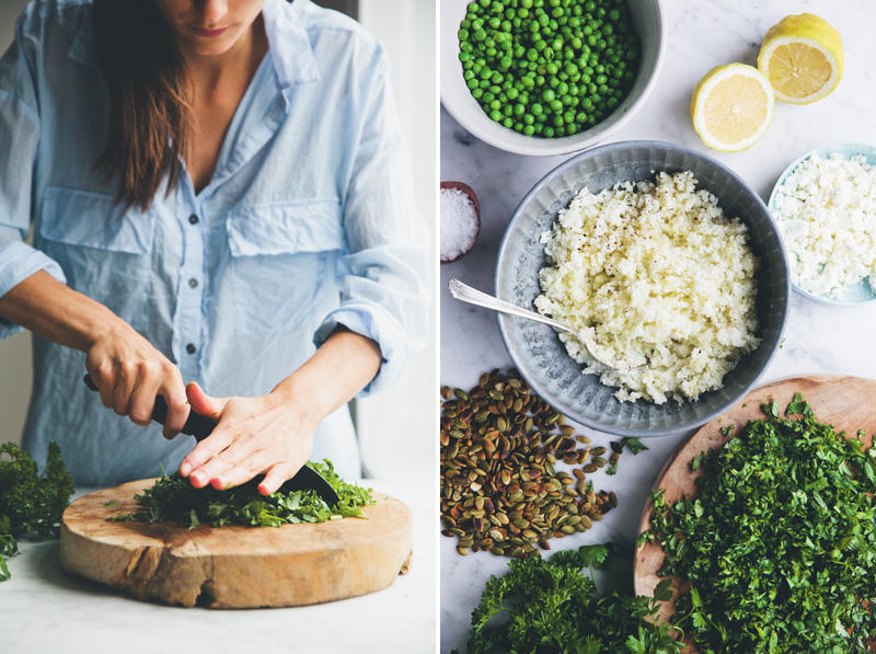 Today we have mixed raw cauli’ into a couscous-like texture that can be used as a grain free alternative to regular wheat grain couscous. We give it a quick boil to get rid of the raw odor and to make it easier to digest, then toss it with an ocean of fresh herbs, spring peas, pepitas and crumbled feta cheese. It’s dinner in no-time and a very fresh, delicious and nourishing one. Perfect for the picnic basket as well.
