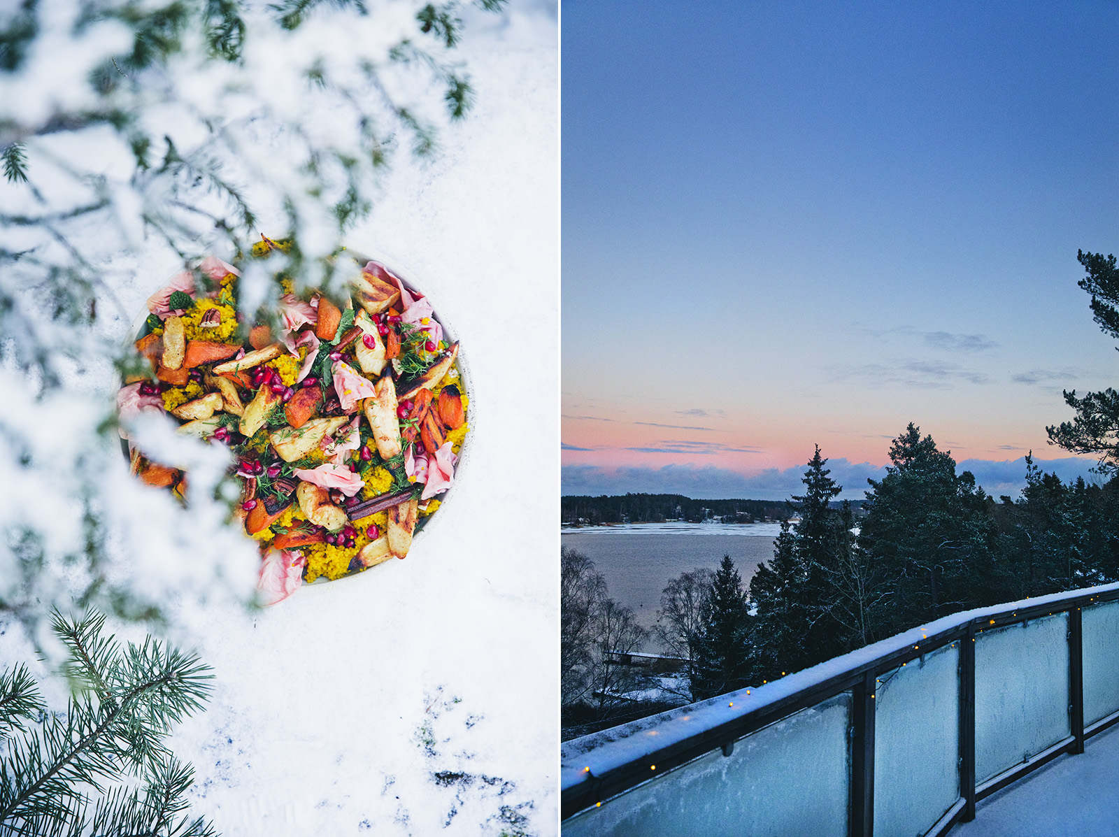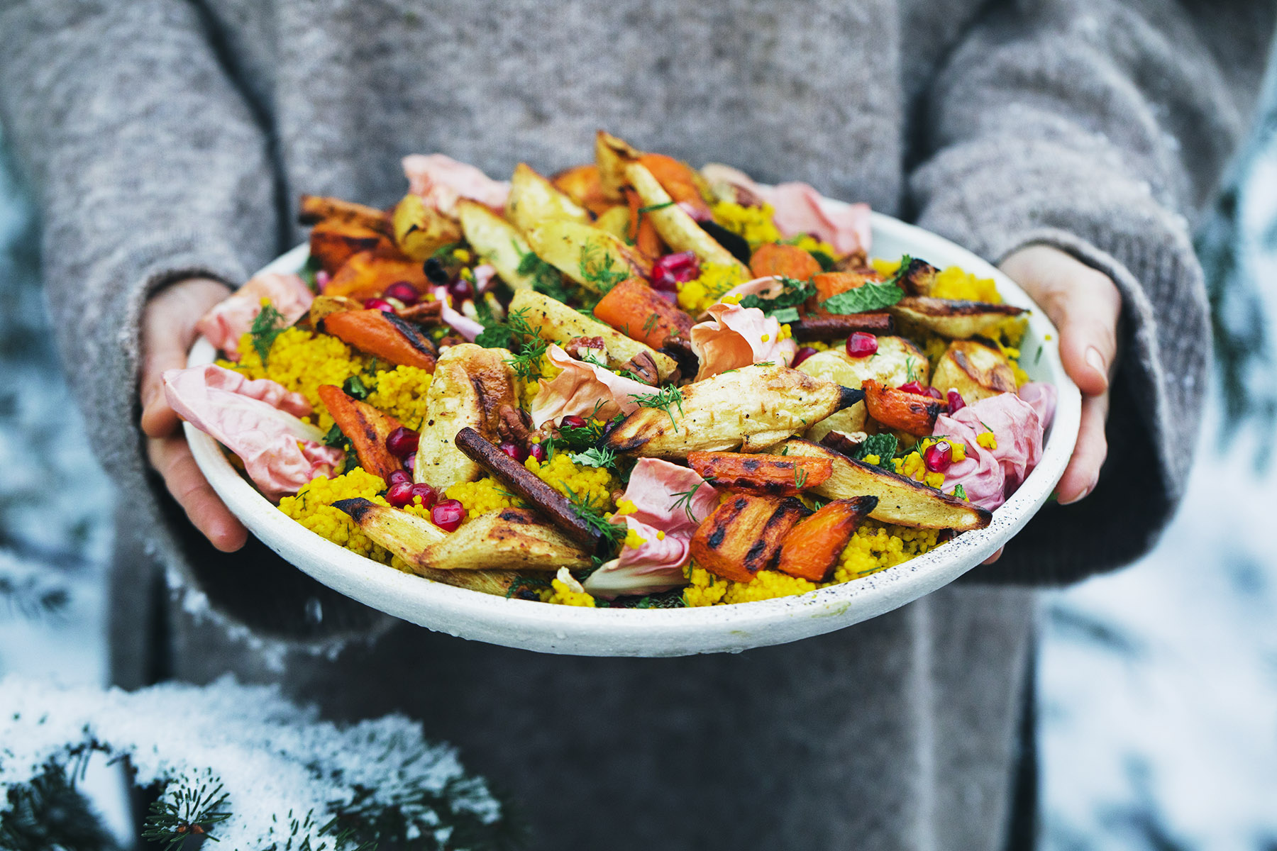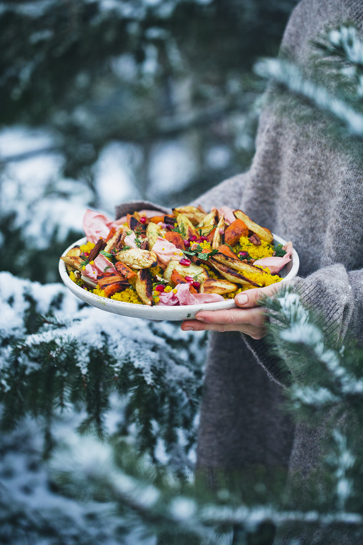 We wanted to share some last minute recipe inspiration in case you still haven't decided what to cook over the holidays. Below you will find a roundup of some of our most beloved GKS Christmas recipes – mains, sides, salads and treats. And if you keep scrolling there is also the recipe for a Saffron & Millet Salad which we think is the perfect crossover between a main, side and salad. While we were cooking this, the snow started falling so when the salad was ready we took it outside and I love how magical the photos came out with the trees and the snow.