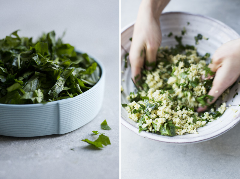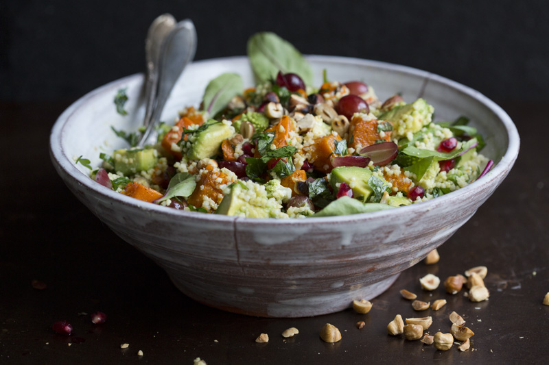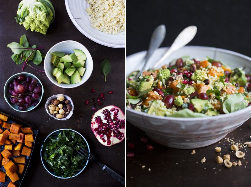 We have used millet in this salad. And although we use it in our home cooking often, we haven’t posted many millet recipes on the blog. It is a gluten free, easy digestible seed, high in minerals like manganese, magnesium and calcium. It is also high in iron and B-vitamins. When cooked it has a grain-like texture; very soft and creamy and similar to couscous. Here we have mixed it with a chunky herb dressing to increase the flavor. We also added roasted pumpkin to make the salad more nourishing, avocado for creaminess, grapes to make it sweeter and hazelnuts to give it some crunch. It has quickly become one of our favorite salads. We have made it several times in a few different versions. You can for example substitute the pumpkin for sweet potato or beetroot, and the pomegranate for cranberries.